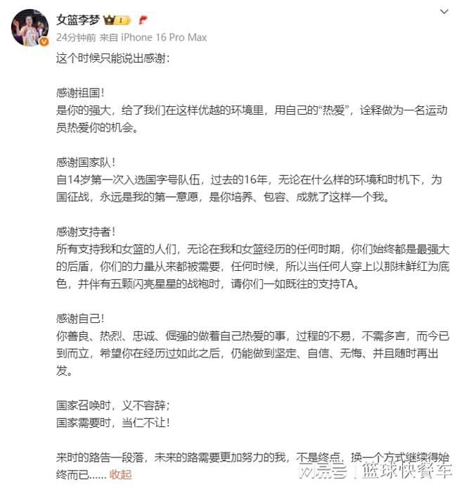落选女篮国家队?李梦第1时间回应宫鲁鸣:连用4感谢疑似谢幕告别