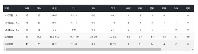 对阵福建U18,18分钟11中11,罚球12中7,拿到29分6篮板3助攻1盖帽,命中率100%;